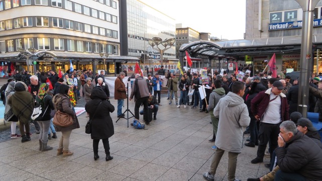 Mit Sprechchören wie „Erdogan – Terrorist“, “ Deutsche Waffen , deutsches Geld morden mit in aller Welt“ und anderen , fand ein „Warm Up“ statt, an dem sich besonders die vielen Jugendlichen unter den Demonstranten beteiligten. Zu Beginn der Montagsdemo stellten die Moderatoren der Montagsdemo die gemeinsame Aktion für unsere gemeinsame Sache und Kampf gegen den Überfall des türkischen Militärs vor. Es wurde eine aktuelle Erklärung der Gemeinschaft der Gesellschaften Kurdistans verlesen, die eindeutig nachwies dass es sich bei der Besetzung von Rojava und der Belagerung von Efrin um die Vorbereitung eines Völkermords handelt und das ein Kampf der gesamten Menschheit dagegen organisiert werden muß.