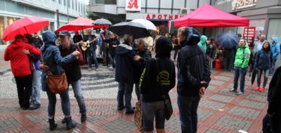 Wenn das Schiet-Wetter eine Probe war – das Jubiläumsfest der Montagsdemo hat sie mit über 100 Gästen glänzend bestanden. Ganz im Gegensatz zur Presse, die sich nicht blicken ließ. Wenn sie oder andere dachten, dass wir die Segel streichen, haben sie sich getäuscht. Flugs wurde gemeinsam angepackt beim Aufbau, den Regenböen getrotzt, Grillstand und vielfältiges Bufett fanden unter Pavillons einen geschützten Platz, die Gäste unter Schirmen, und Punkt halb sechs ging es los wie seit 15 Jahren. Das Wetter besserte sich zumindest zeitweise – bis zum nächsten kühlen Guss und Regentanz. Der Stimmung tat das keinen Abbruch. Ein vielfältiges Programm wurde mit bester Feierlaune gestaltet und genossen. Einen breiten Bogen spannten die Teilnehmer und Gäste mit ihren Beiträgen. Drängendes Thema ganz vornedran: der Kampf für die Rettung der Umwelt, die Jugendlichen vom REBELL forderten Alte wie Junge auf, sich einzubringen bei den „fridays for future“. Wir nehme uns als Ziel vor, die Bewegung mit zu stärken gegen alle Spaltungsmanöver. Mit den Kumpels nehmen wir den Kampf auf gegen Entlassungen und Zechenflutungen.